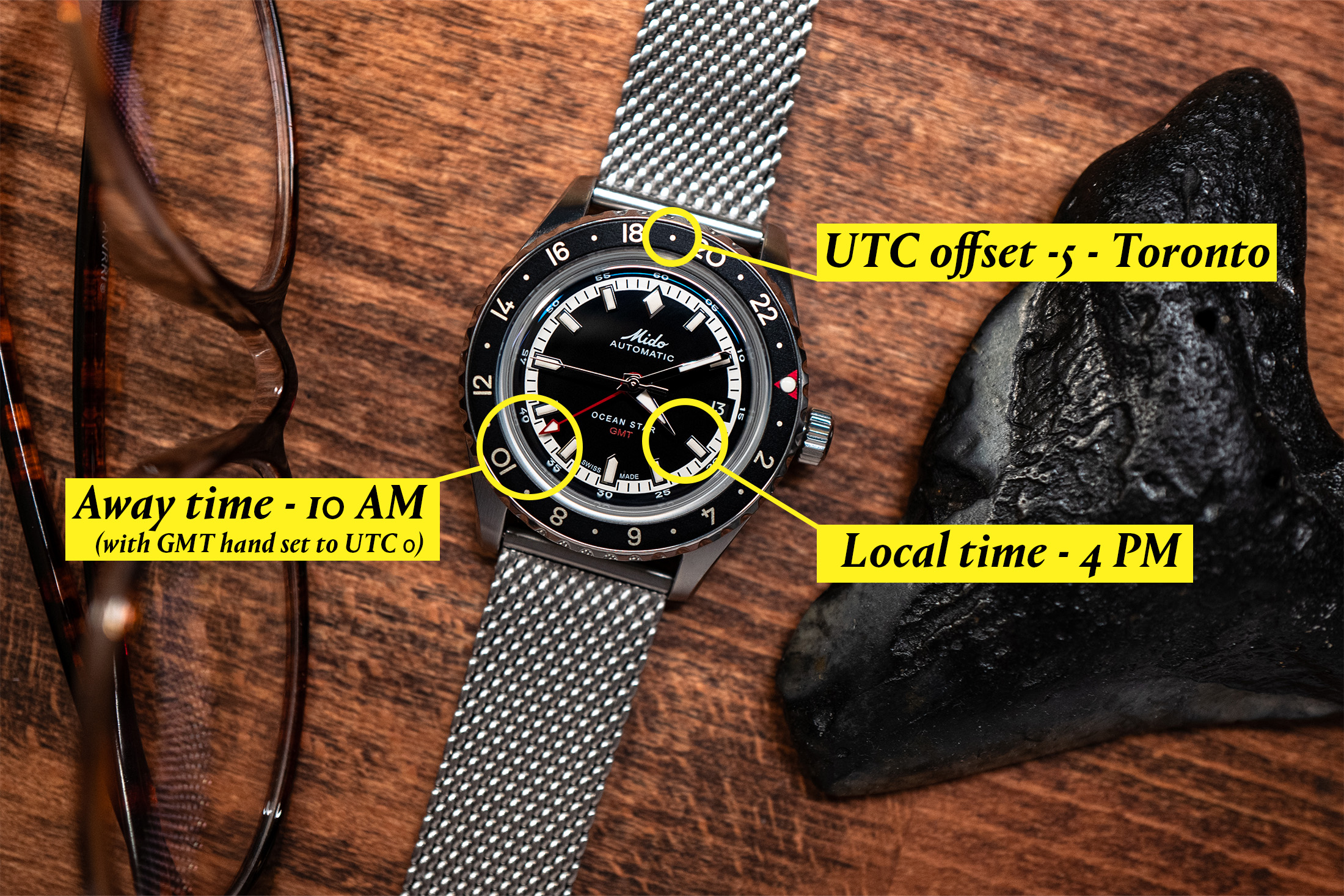 The Mido Ocean Star GMT LE exhibits native time in Geneva (4 PM), the GMT hand set to UTC 0, and the bezel rotated to position 19 on the 12 o’clock place to account for the UTC -5 of Toronto (24-5 = 19).