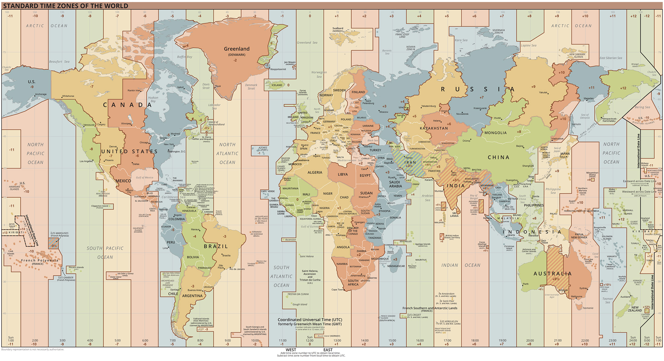 A map of the usual UTC time zones (UnaitxuGV, Heitordp and others, Public area, through Wikimedia Commons).