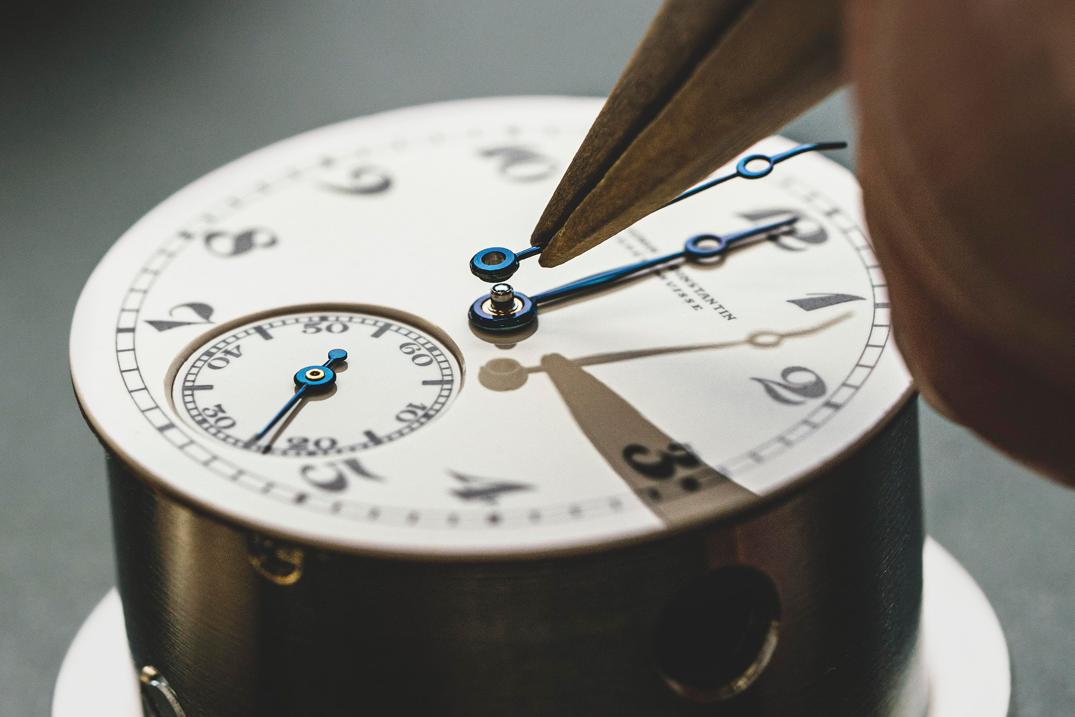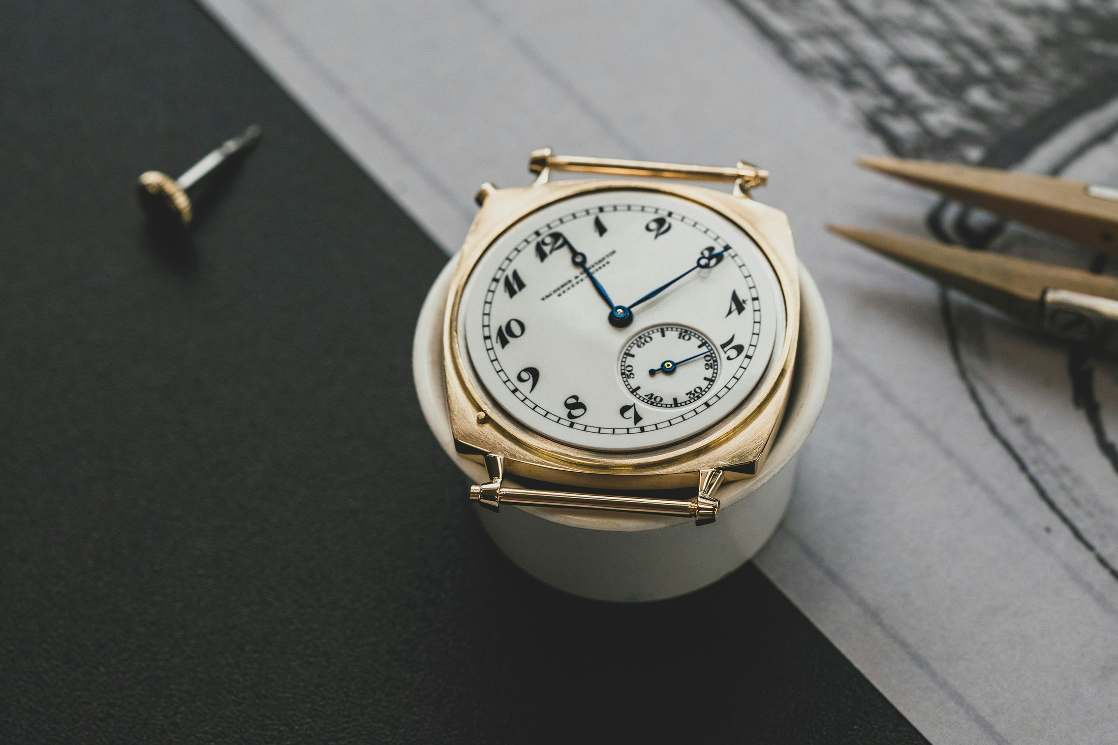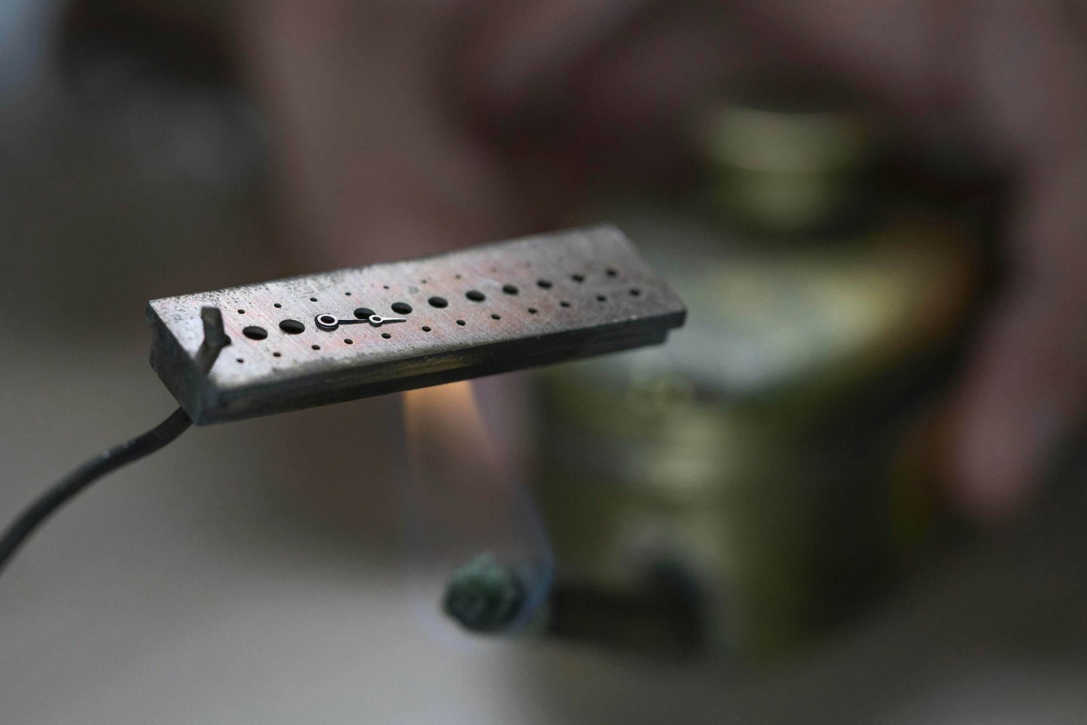 The blued metal arms, in contrast to the dial, are precise new outdated inventory components. Made in 1921, they had been saved in Vacheron’s components archive in an unblued state, and warmth blued in Vacheron’s restoration workshop in 2021, particularly for this mission. Warmth bluing is completed by putting the metal half on a block, which is then slowly heated over a gasoline flame. It’s a difficult course of – once you heat-temper metal it begins to paint at round 350º, however between 450º and 590º, it modifications shade quickly, shading from a lightweight to darkish brown, to a deep purplish hue, earlier than hitting the cornflower blue normally desired for warmth blued watch arms.