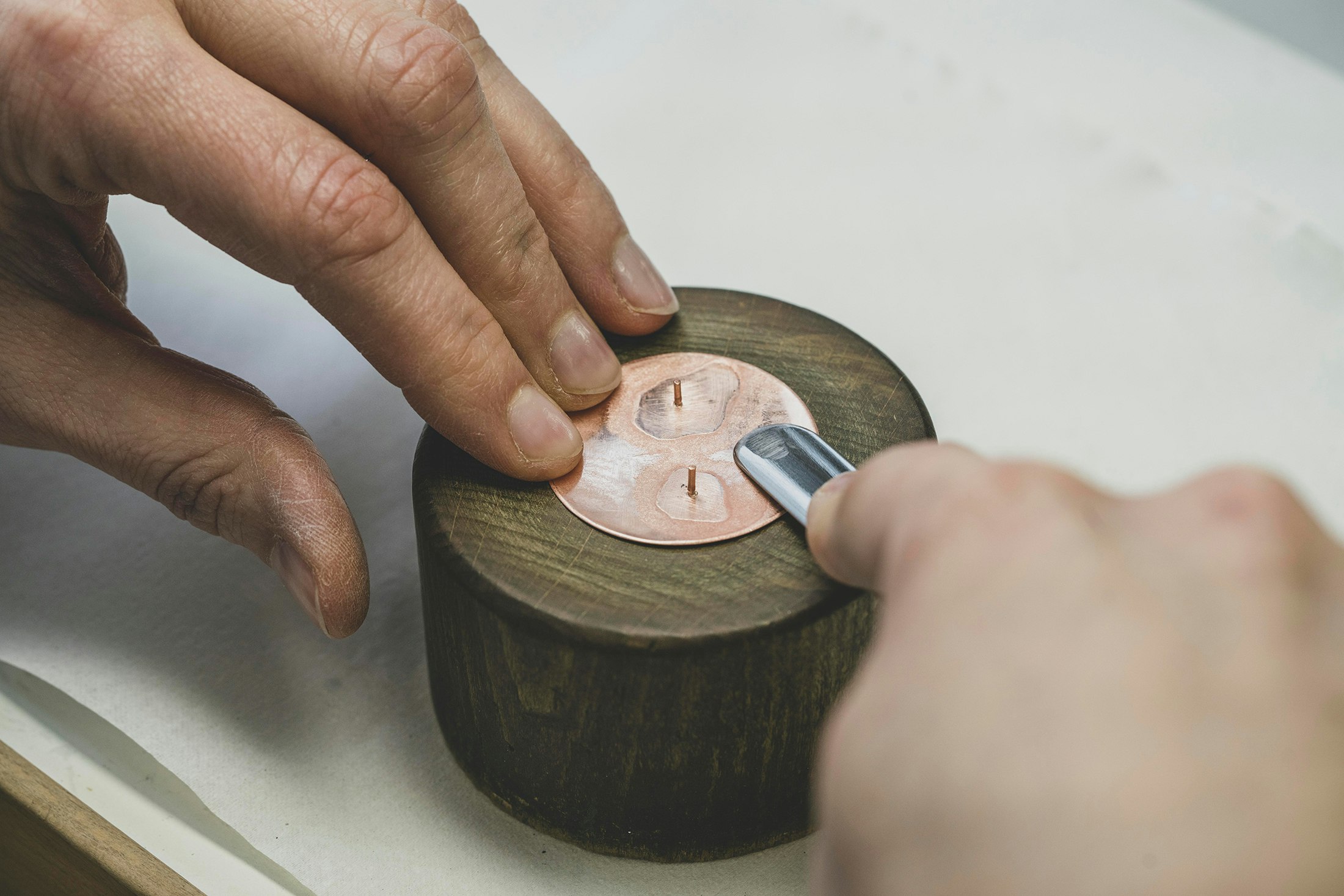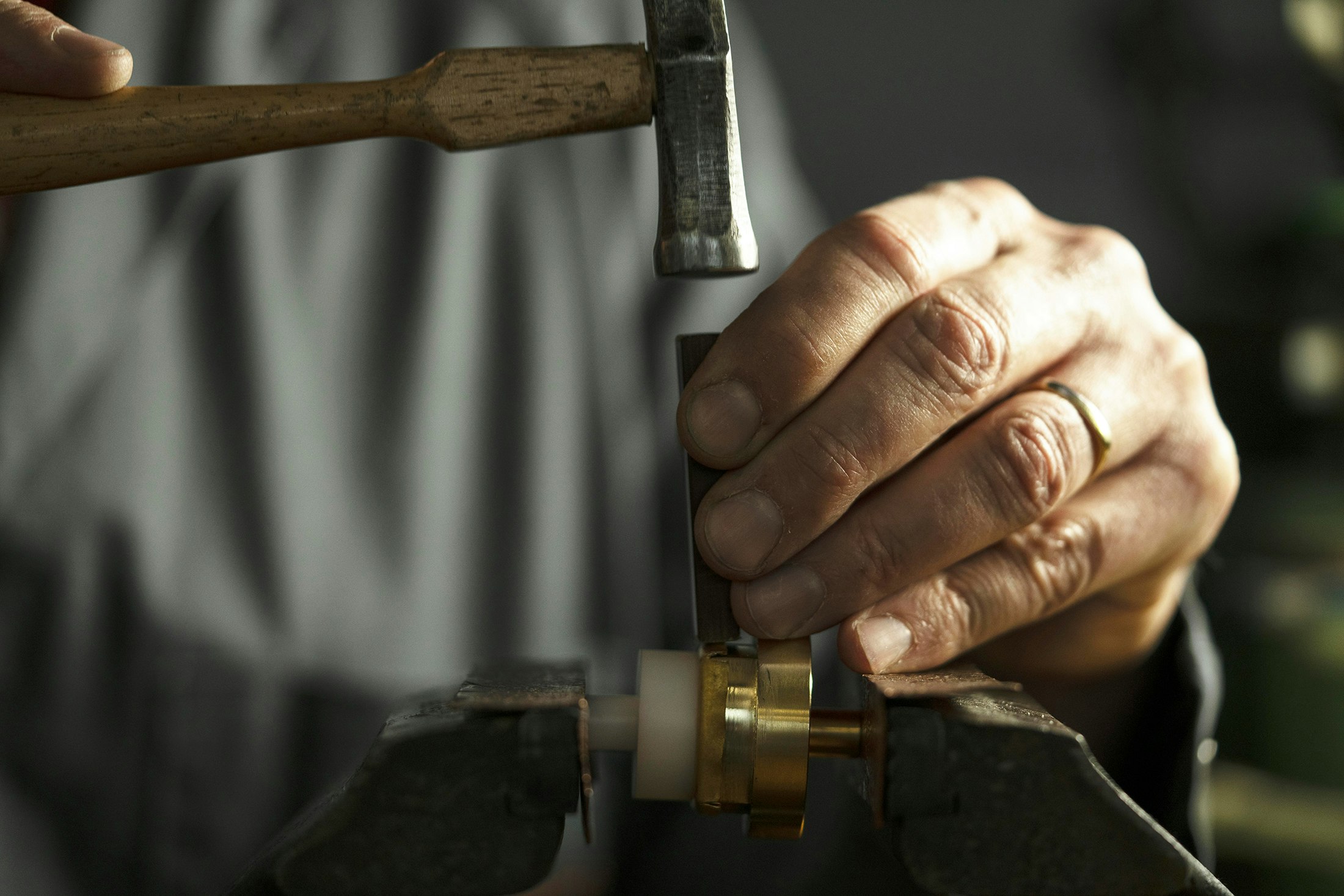 Shaping the bezel with a jeweler’s hammer.