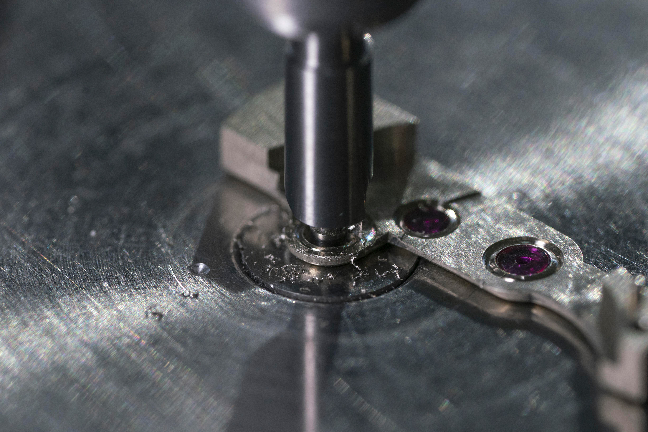 For the distinctive piece, the jewels had been first pressed into place, utilizing a tool known as a staking device. The setting of every jewel is then accomplished by elevating the metallic round it to safe it in place – a course of much like methods used to set gem stones in jewellery. The holes for jewels within the mainplate and bridges had been drilled utilizing an 18th century upright drilling device.